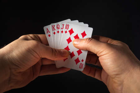 Poker cards with a royal flush combination. Close-up of a gambler hand is holding playing cards in casino