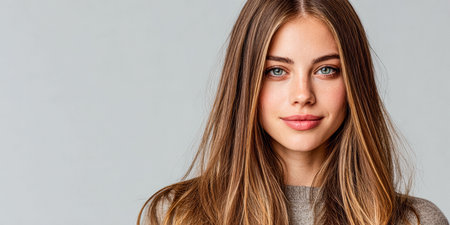 A young model poses with long, smooth hair in a beauty studio. Soft lighting accentuates her features against a neutral gray backdrop. She exudes confidence and elegance.
