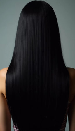 Smooth, straight black hair flows elegantly down back, highlighting its healthy shine and uniform color, illuminated by soft lighting, creating striking look. Hair care, the effect of cosmetics. AI.