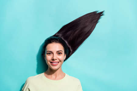 Photo of positive happy nice young woman smile good mood fly long hair isolated on green color background