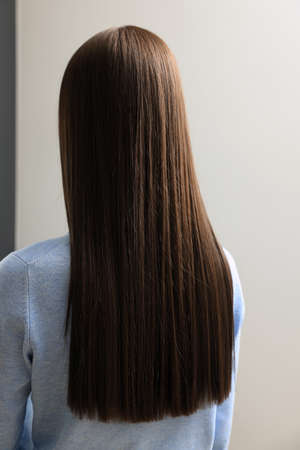 Model girl with long, shiny brown hair, keratin straightening, smooth and elegant hairstyle, beauty care procedure