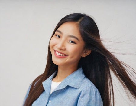 portrait of cute asian woman smiling young woman with dark long brown hair in wind on white background