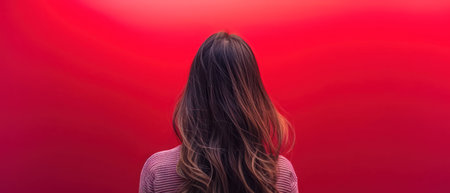 Back view of a young woman with long hair on a red background