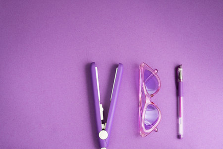 purple flat lay: hair care tool, pen, sunglasses on a purple background