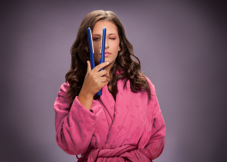 Young woman pondering over a hair iron against a vibrant purple background, wearing shiny casual attire