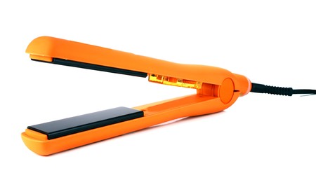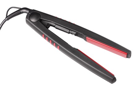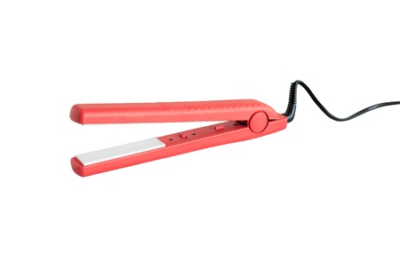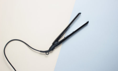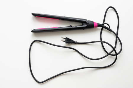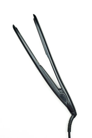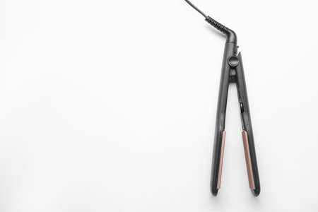 Hair iron on white background. Black hair straightener. Electric curling iron hair straightener