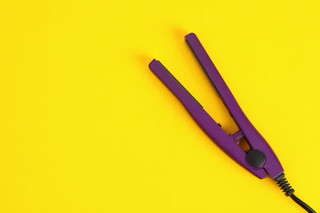 Hair straightener on a purple background with yellow circle in the middle. Top view. Minimalistic beauty and fashion concept