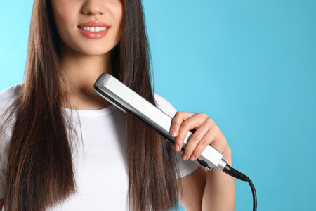 Woman straight hair using hair straightener. Hair ironing and hairstyle concept