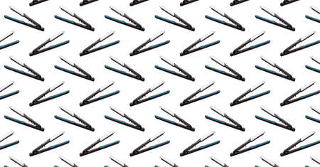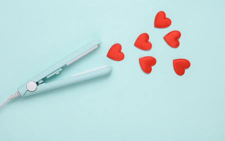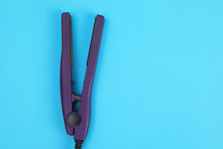Hair straightener on blue background. Top view, flat lay. Minimalism