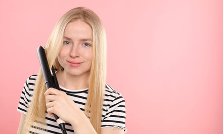 Smiling woman ironing long hair with flat iron. Happy young woman straightening hair with straightener. Portrait of young beautiful girl using styler on her shining hair. Hairstyle