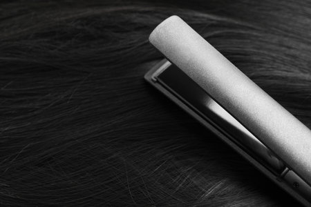 Professional equipment for hairdressers. Black hair iron in hand of master straightens with keratin
