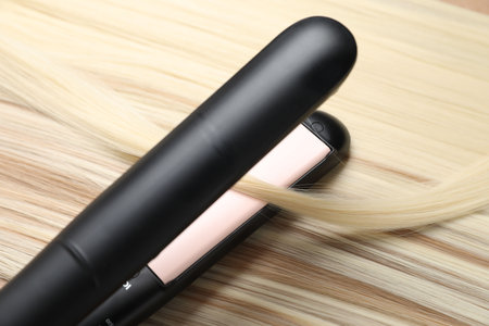 strand of woman blonde curly hair isolated and straightener,curling iron,dryer rotating brush
