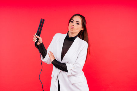 Woman flat iron hair straightener tools, heat and cosmetics hairstyle, fashion and beauty of long hair care on studio background. Happy young girl model ironing hair style for beautiful salon shine