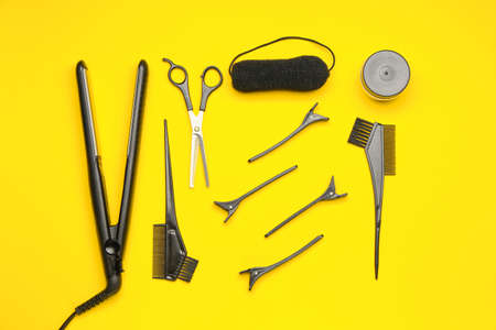 Minimalistic beauty and fashion still life. Comb and hair straightener on blue yellow background. Top view, flat lay