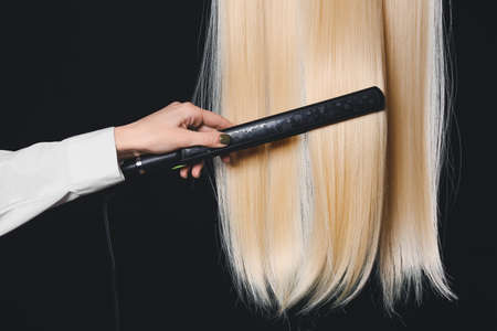 Close-up of master hairstylist ironing for straightening hair restores keratin and straightens hair.
