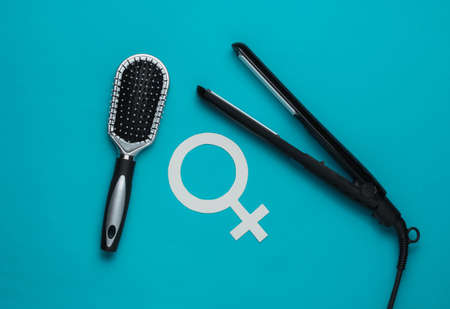 Women's hair care accessories. Gender female symbol, comb, hair iron on blue color background. Top view