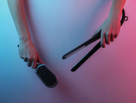 Hand holds hair straightener and comb. Creative pop art pink blue neon color. Trendy gradient illumination. Night light