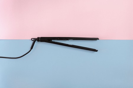 Electric curling iron with ceramic plates on blue and pink background. Top view. Still life. Flat lay. Copy space