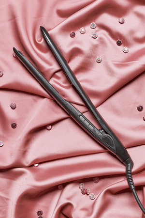Hair care. Female hand holding hair straightener on pink background. Top view