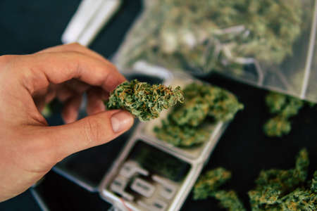 A drug dealer weighs cannabis flower marijuana on a scales concept of legalizing herbs weed close up