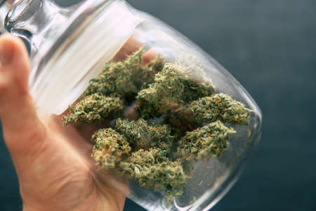 The young person are holding medical marijuana buds in his hand. Cannabis is a concept of herbal medicine. Marijuana is medicine