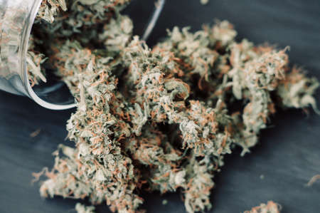 Close up of medical marijuana or cannabis flower buds in glass jar