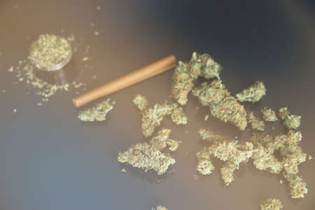 Close up of marijuana blunt with grinder. Rolling a marijuana joint.