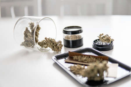 Rolling a marijuana joint. Close up of marijuana blunt with grinder. Cannabis use concept. Preparing and rolling marijuana cannabis joint.