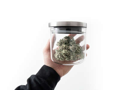 The sugar pot leaves on buds. cannabis buds in glass jar. Mans hands marijuana bud. Marijuana nature. White background. CBD THC herb. Harvest weed time. Sativa medical health.
