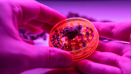 Herb grinder Fresh marihuana. Close up. Cannabis buds in hand on black background Background