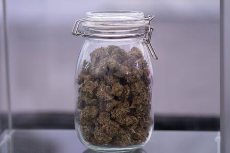Close up of medical marijuana or cannabis flower buds in glass jar