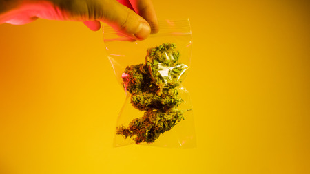 The young person are holding medical marijuana buds in his hand. Cannabis is a concept of herbal medicine. Marijuana is medicine