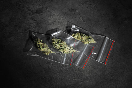Law enforcement officers are engaged in marijuana-related operation within an urban environment. One officer is handing over clear plastic bag containing packaged marijuana buds. AI generated.