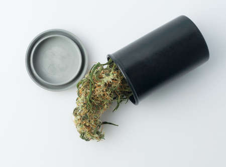 Cannabis bud in packaging on a white background. Medical cannabis drug.