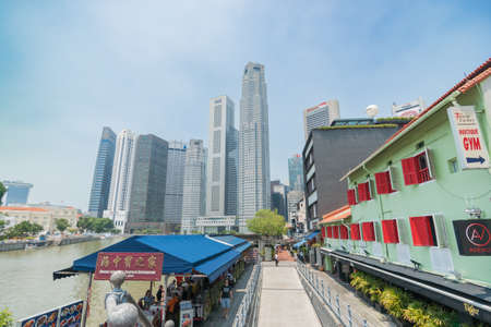 Singapore - August 15 2015; Street scene, floating restaurant and commercial high-rise buildings beyond River Walk at Boat Quay.