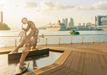 Singapore - March 1, 2016: Metal Sculptures of Jazz Players and Singapore Cruise Center at Harborfront and Sentosa Boardwalk leading from Mainland Singapore to Sentosa Island. At sunset