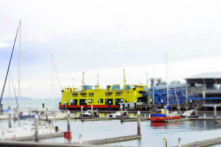 Georgetown, Penang/Malaysia - Feb 28 2020: Aerial blue ferry arrive Penang. Background is KOMTAR.