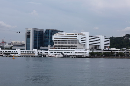HARBOURFRONT, SINGAPORE - JANUARY 3, 2017: Wide view of ferries and cruise ships docked along the Sentosa bay on a cloudy day, with cable cars in the background. Travel and tourism.