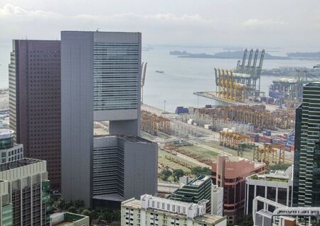 SINGAPORE - JANUARY 13, 2018: Singapore cityscape with modern buildings and Singapore port cargo terminal, top view.