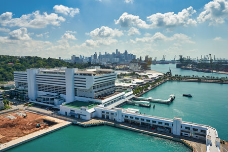 aerial view of Singapore, a city-state in Southeast Asia including a distant view of the port