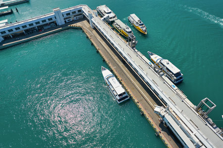 Georgetown, Penang/Malaysia - Feb 28 2020: Aerial view two blue ferry in morning.