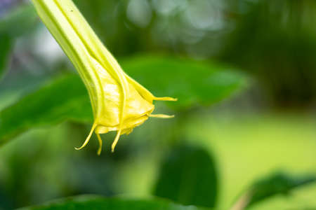 yellow Brugmansia or bunga terompet, angel's trumpet or Datura flower blossom in a garden