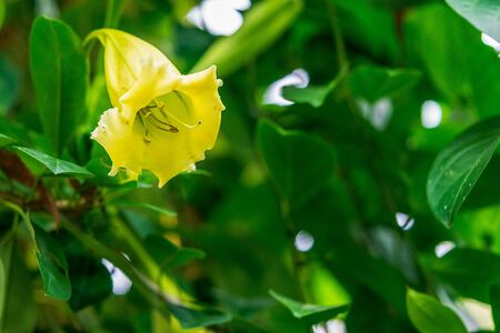 Beautiful large bell shaped yellow flower called Solandra grandiflora close up nature green background and copy space