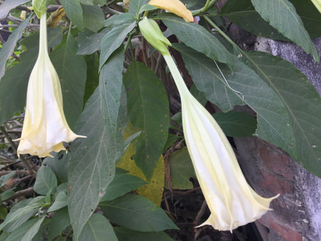 Beautiful flowers of Brugmansia aurea ( Datura aurea ) in garden. Montenegro