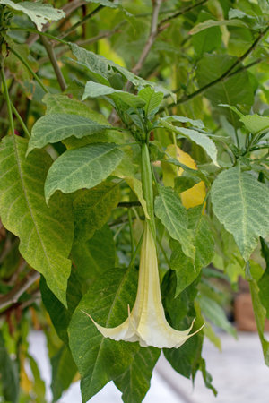 Brugmansia suaveolens flower and leaves. Brazil white angel trumpet white bloom and foliage. Angel's tears or snowy angel's trumpet flowering ornamental plant.