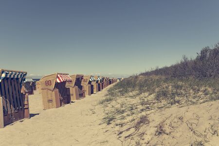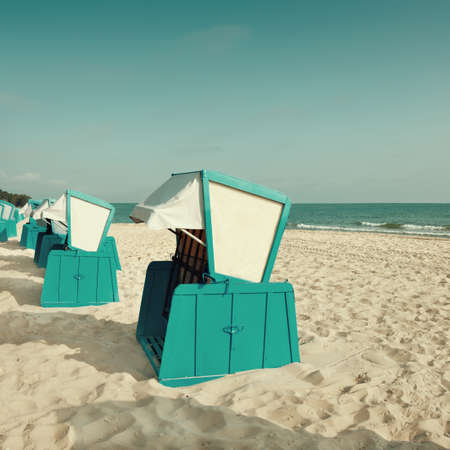 Sandy beach and traditional wooden beach chairs on island Rugen, Northern Germany, on the coast of Baltic Sea. Square composition. This image is toned.