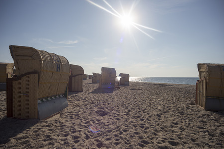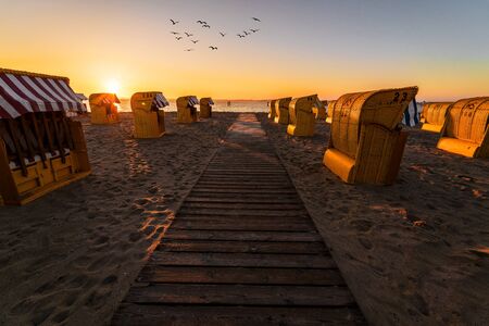 Beach chairs at sunrise on Sylt island, Germany. Wicker chairs on an empty beach at the North Sea and sun rays.