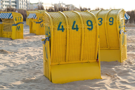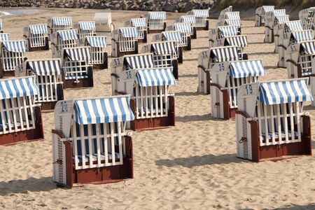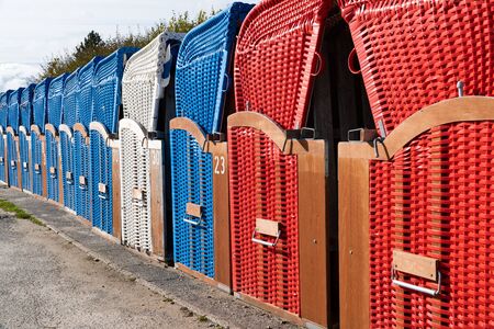 Cuxhaven- September 13 2020: Cuxhaven, Germany. Close-up of beach chairs on a sunny day in autumn on the North Sea in Germany.