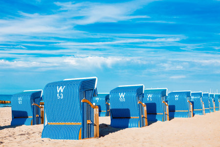 Heringsdorf, Germany - September 09, 2021: Beach chairs on the beach of Heringsdorf on the German coast of the Baltic Sea on the island of Usedom