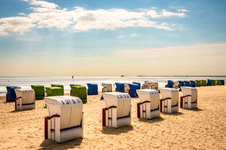 Sandy beach and typical hooded beach chairs in Cuxhaven in the North Sea